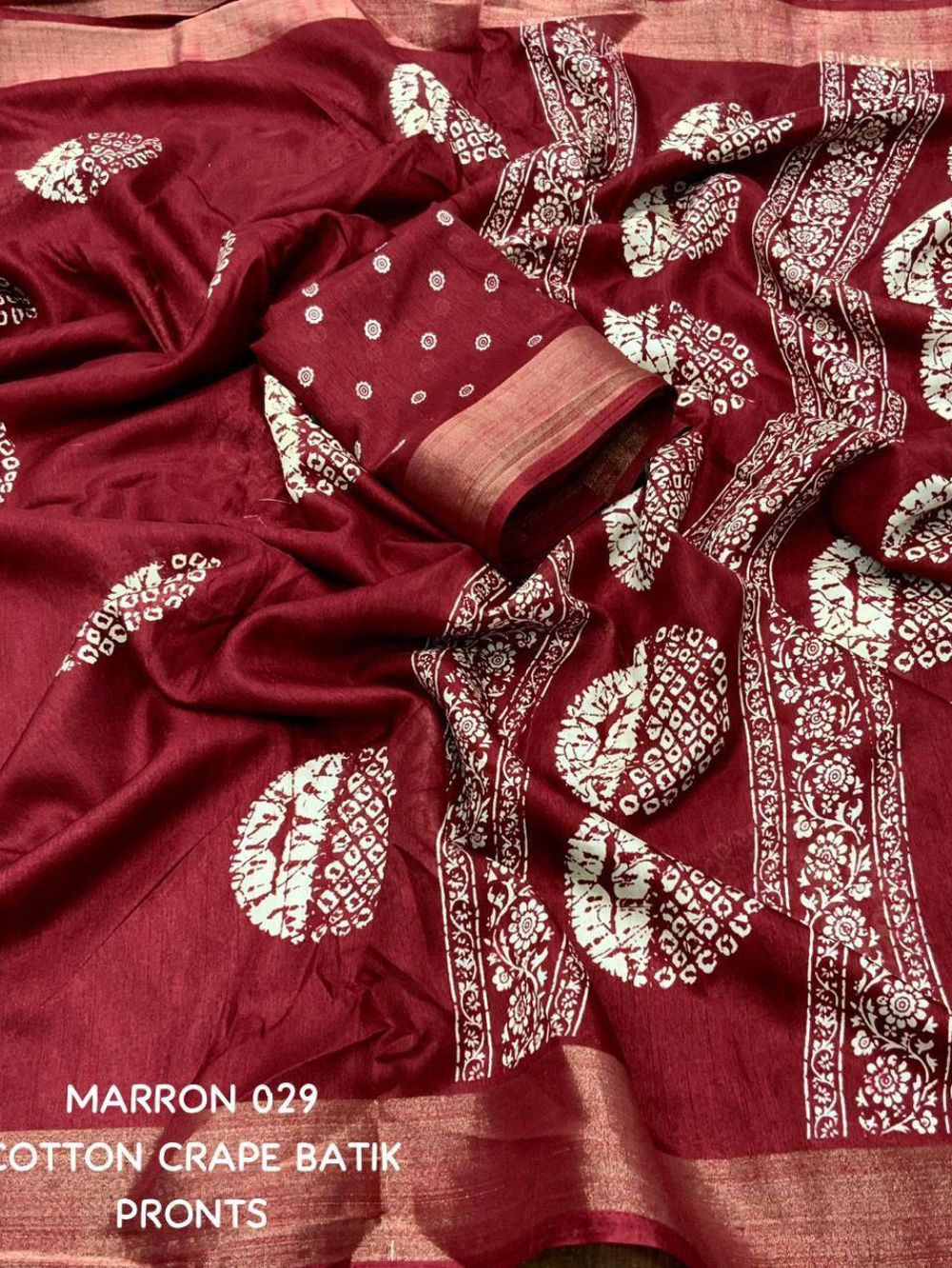 | Design: | Batik print with zari pattu woven border |