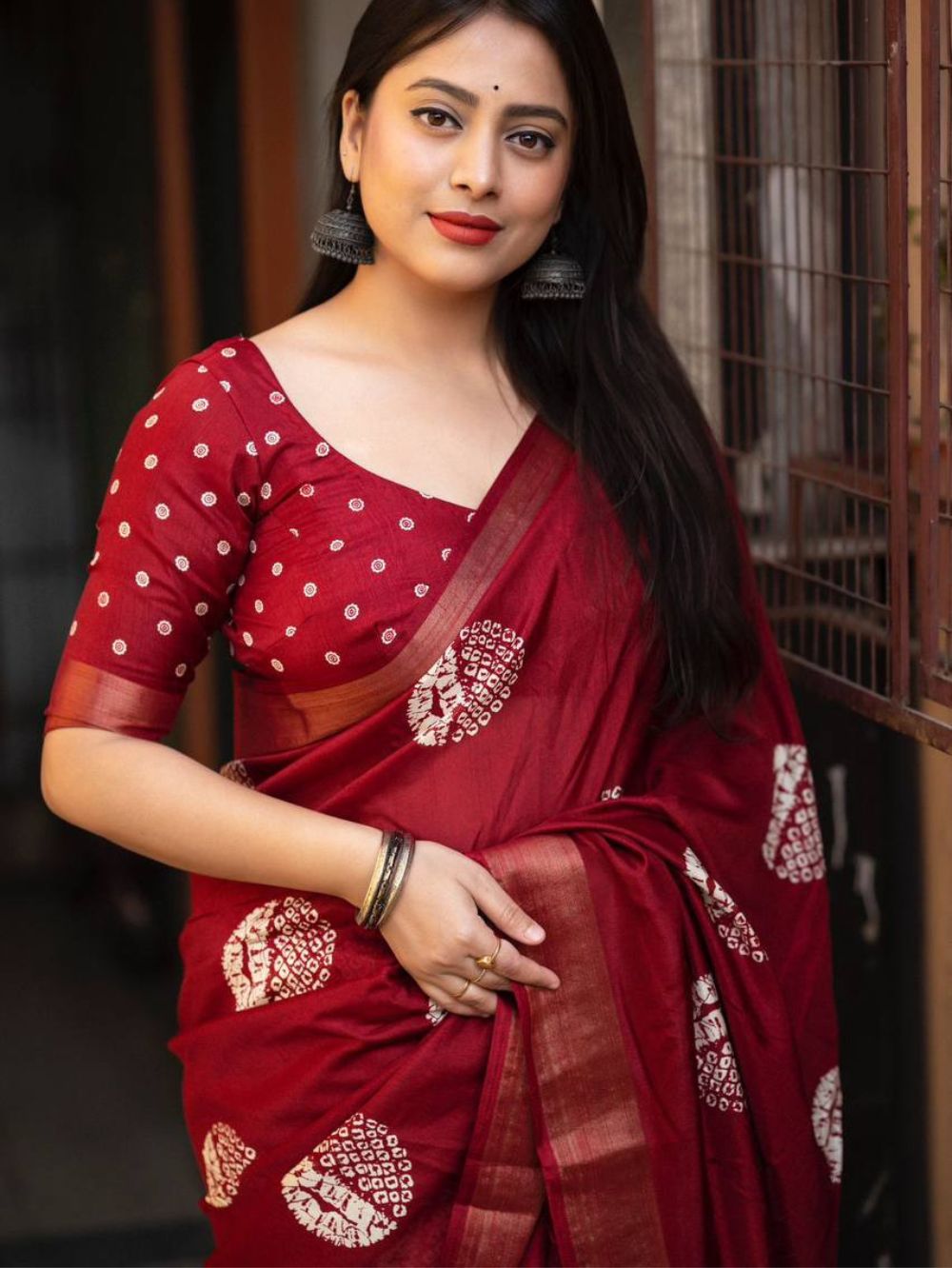 Blue Dhaara’s vibrant and lively, the Maroon saree radiates freshness and vitality, suitable for a variety of occasions from festive gatherings to casual outings. These sarees can be a popular choice for outdoor events and celebrations. Fabrics like cotton crepe lend a lightness and grace to the sarees. Intricate Batik patterns are nature inspired designs that elevate the beauty. The saree can be accessorized with earthy tones for a harmonious look.